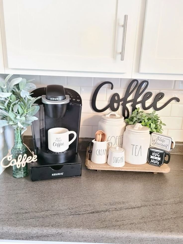 A dedicated coffee or tea station makes mornings smoother. I like keeping mugs, pods, and sugar together in one corner. It keeps the mess contained and gives a clear sense of order.