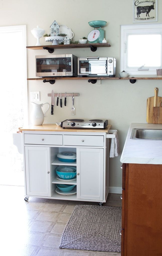 In my experience, a rolling cart keeps counters clear and reduces clutter instantly. It’s one of those simple investments that make a small kitchen feel much larger. Even better, many rolling carts come with multiple tiers, so vertical storage is built-in.