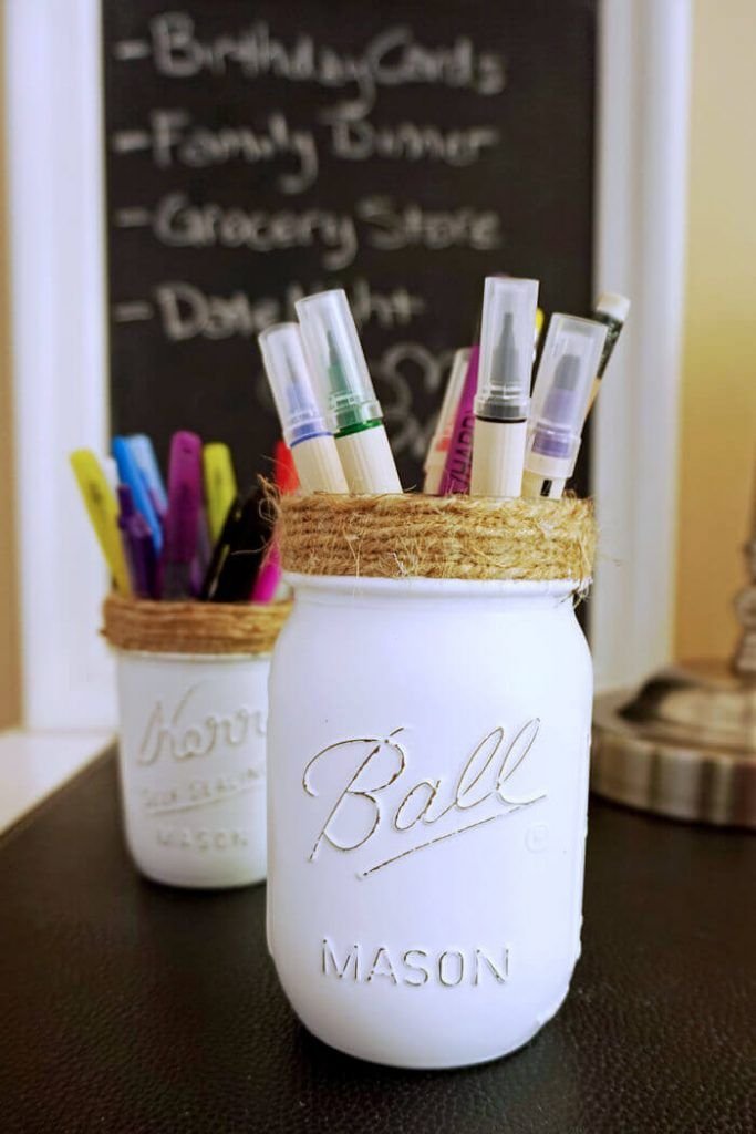 If your desk gets messy like mine, mason jars will save you. They hold pens, scissors, markers, earbuds, and more.