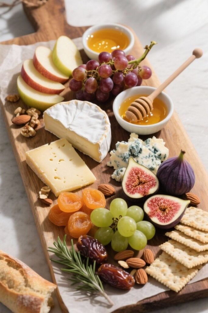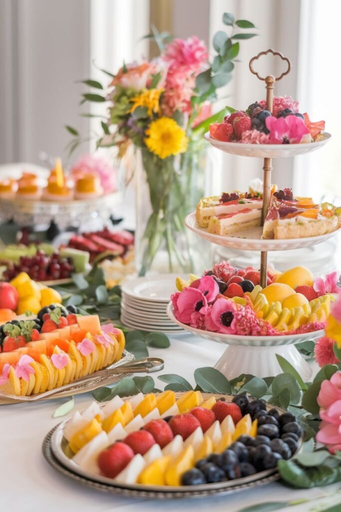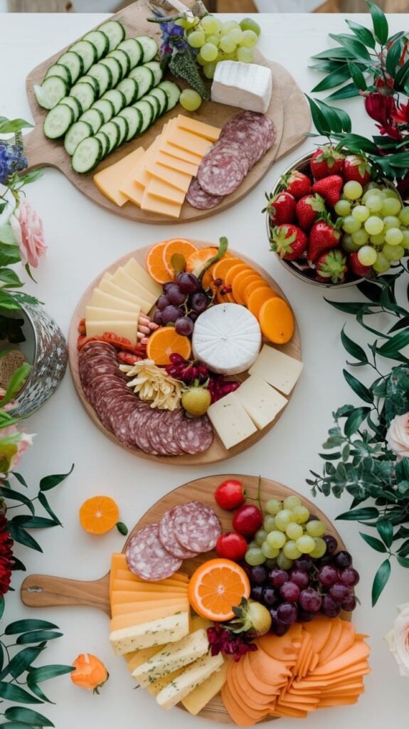 I arrange flowers around the edges to frame the board. That small detail makes everything feel elevated.