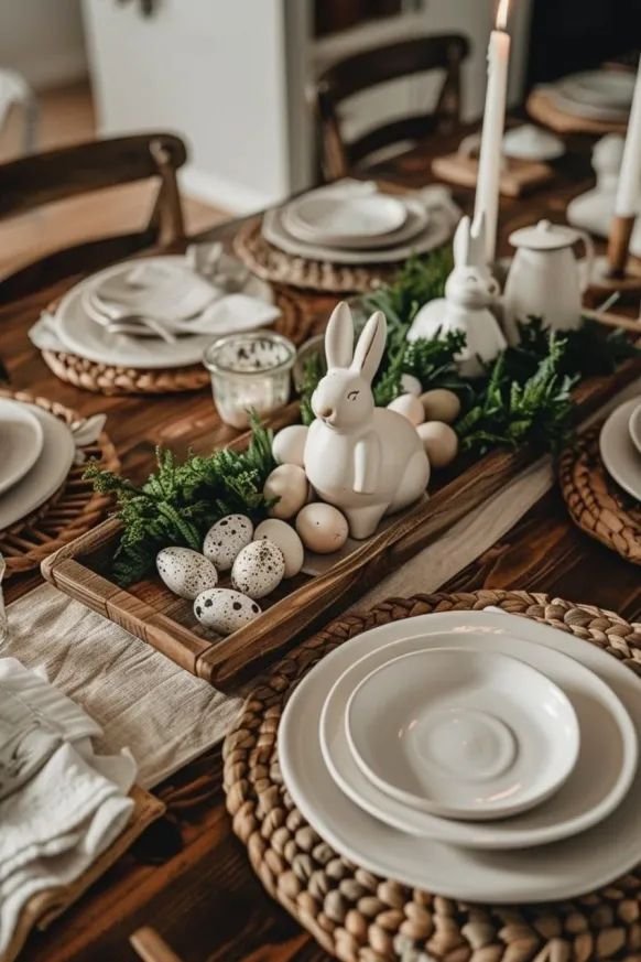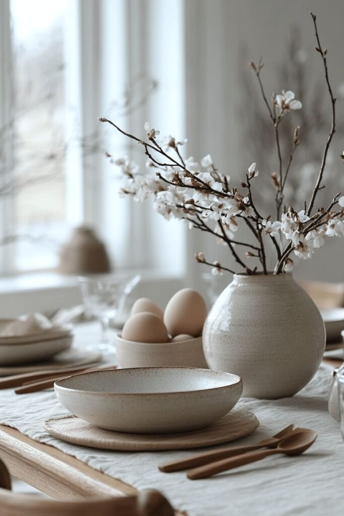 Think natural wood, neutral linens, and soft greenery. This Easter table setting feels welcoming and relaxed.