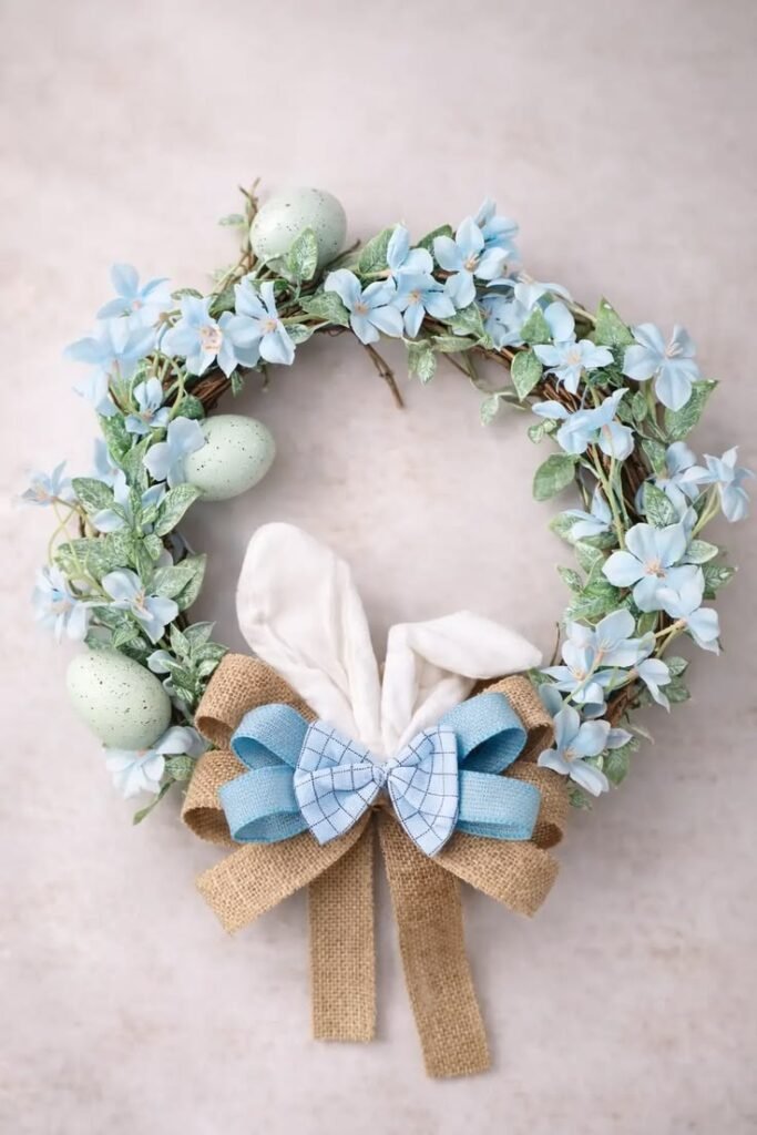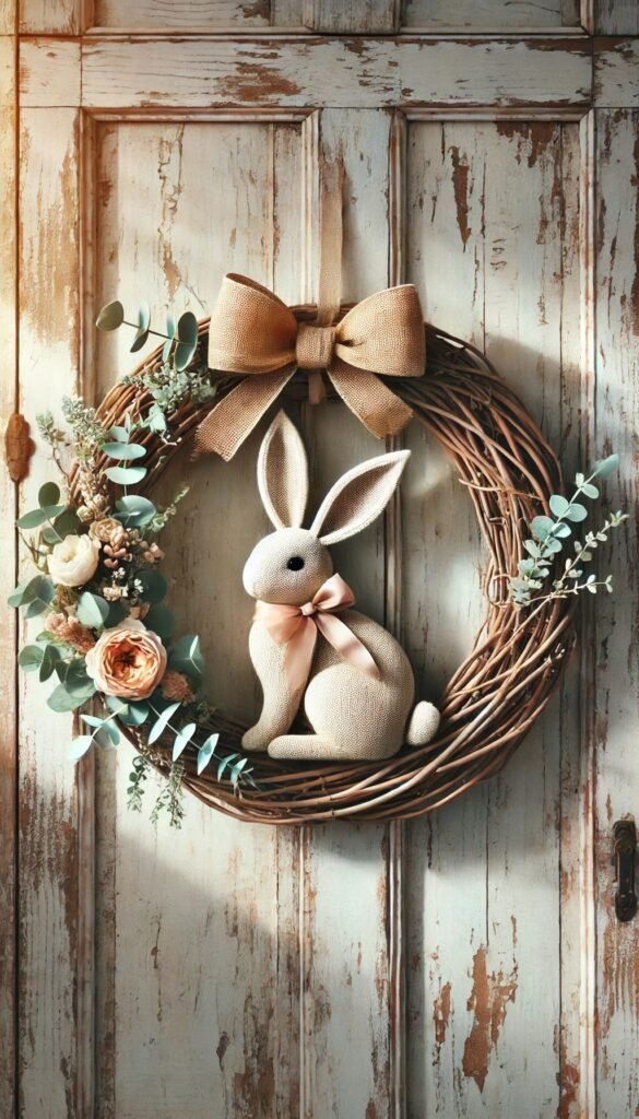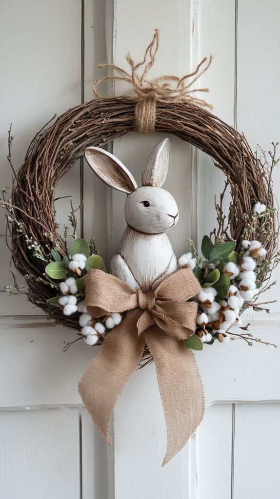Use a grapevine or faux moss base. Add a wooden bunny silhouette in the center. Wrap burlap ribbon loosely around one side.