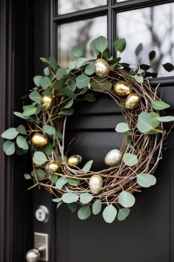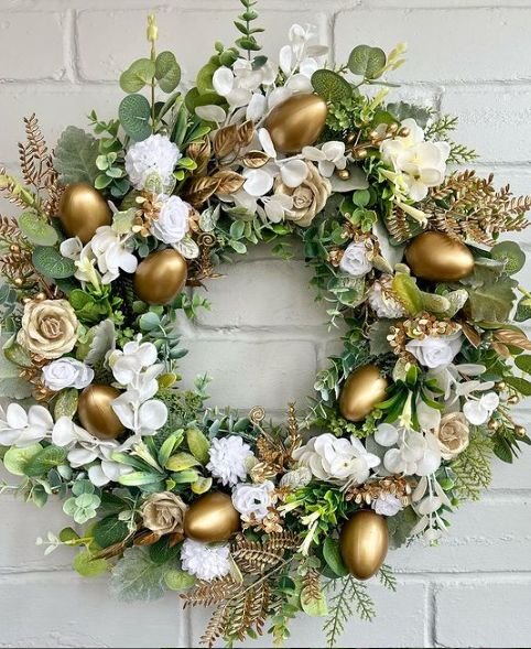 This wreath combines white florals, soft greenery, and subtle gold accents. Think metallic egg details or a thin gold frame base.