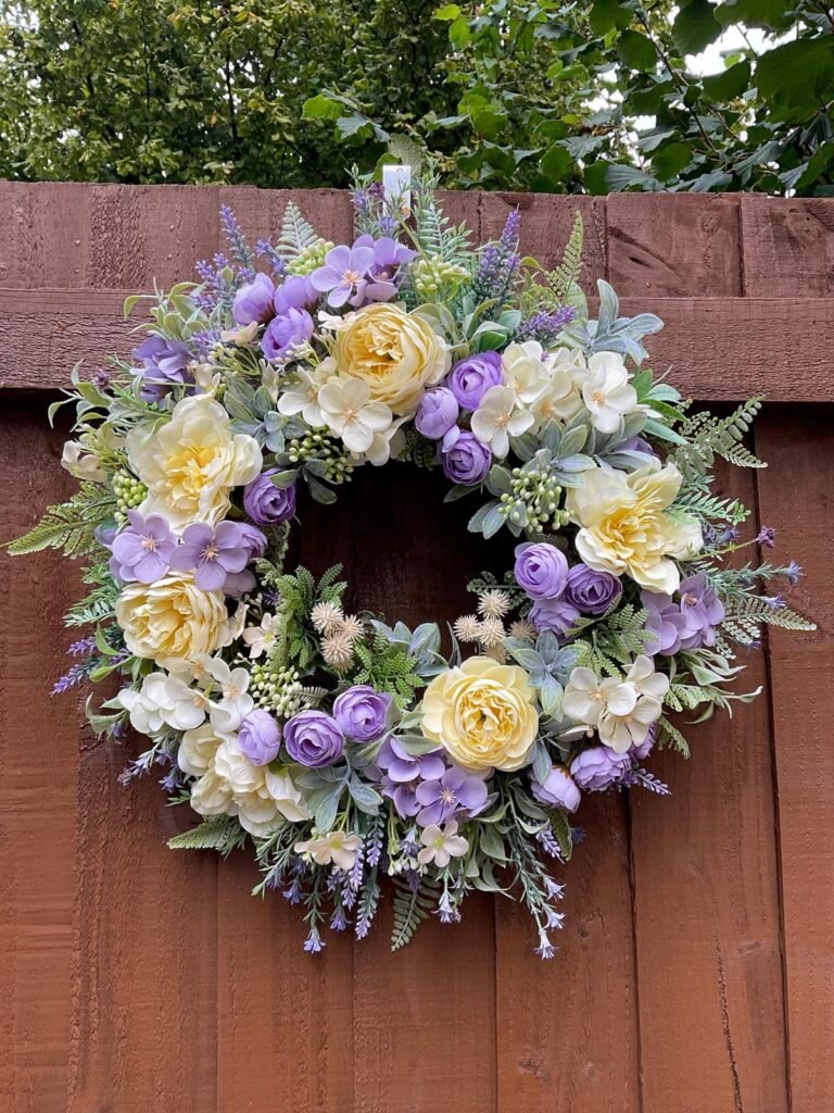 Picture a grapevine base layered with soft pink peonies, white hydrangeas, and hints of lavender. Add subtle greenery and maybe a small bow in blush or cream.