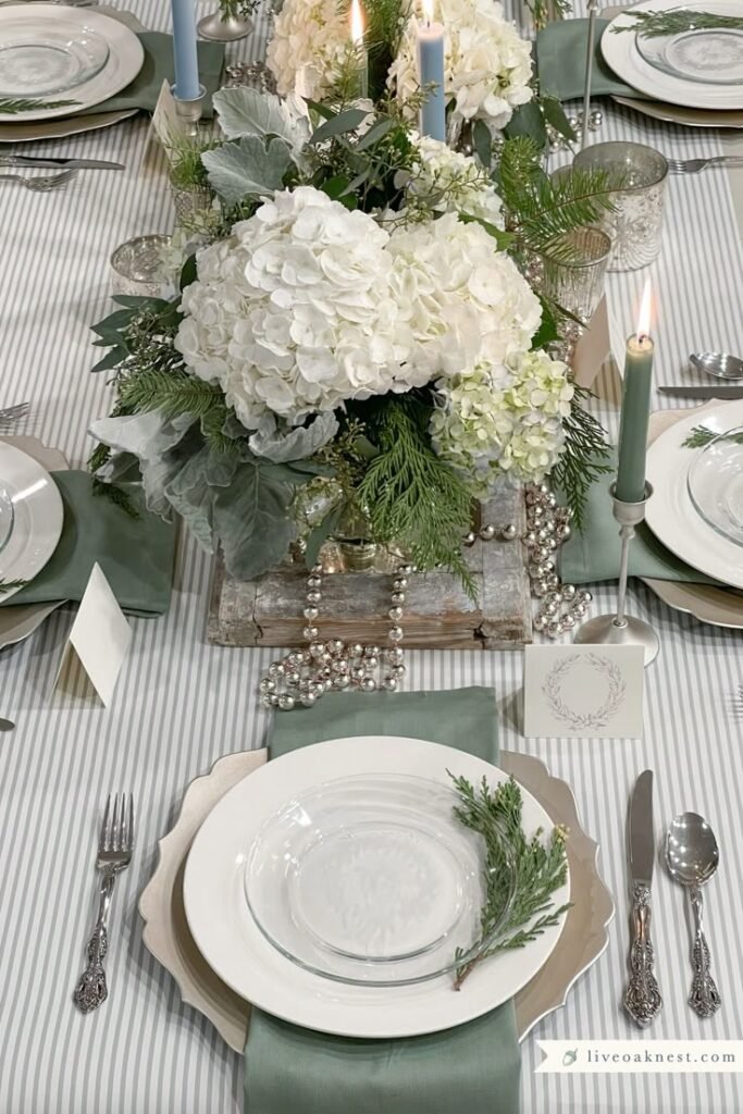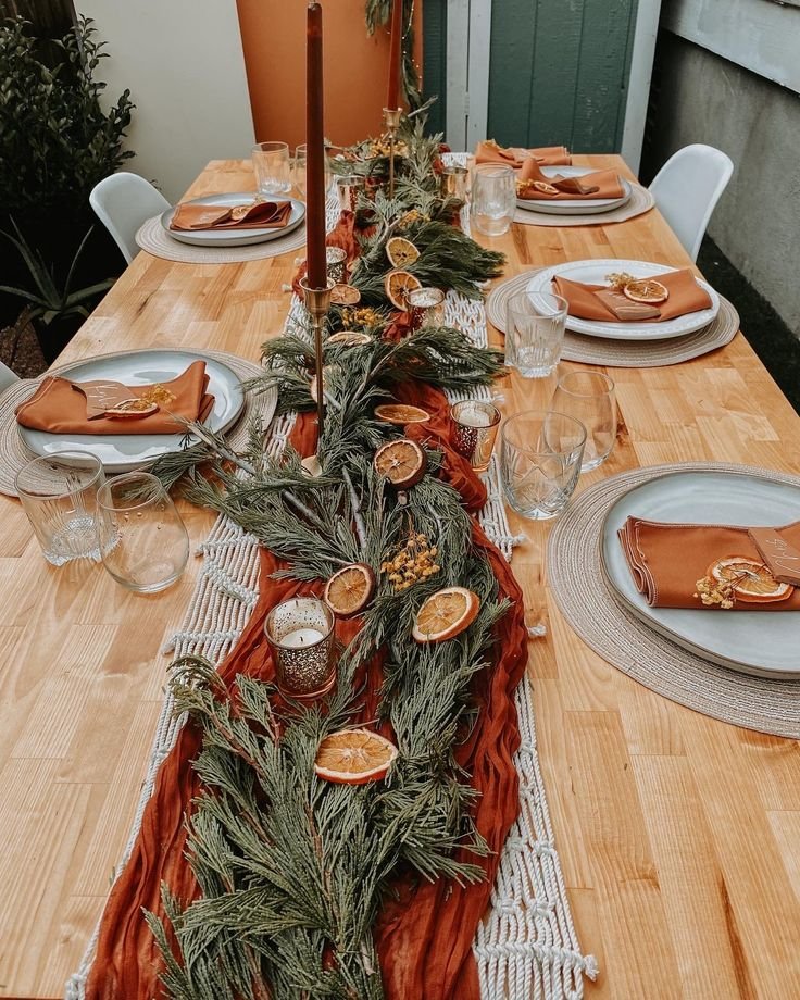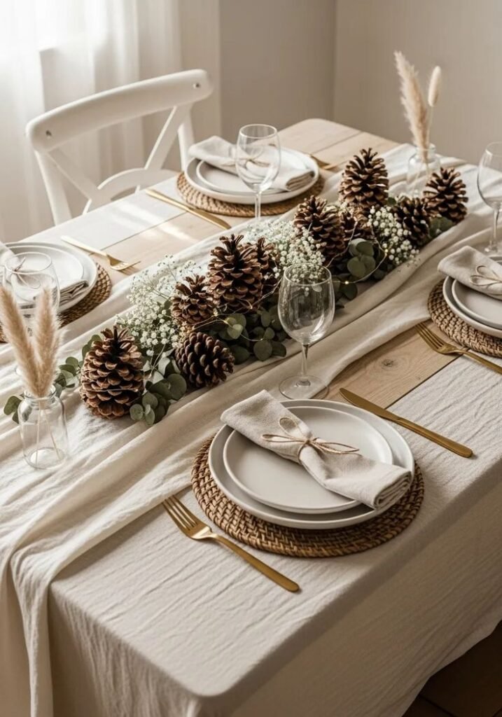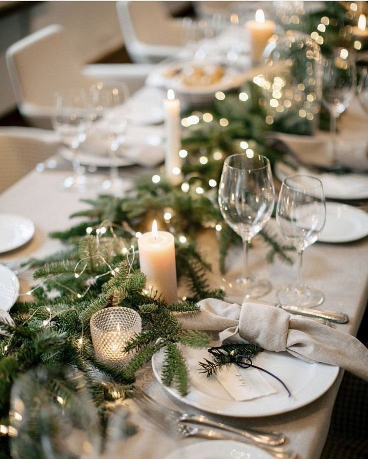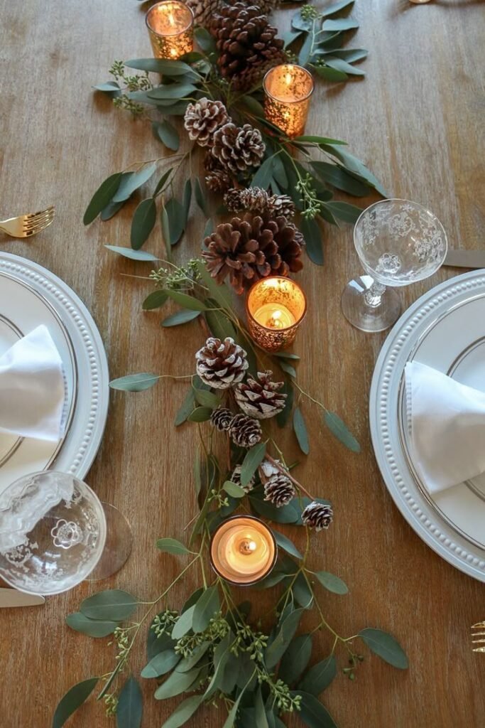 I love greenery because it feels timeless. According to my experience, evergreen branches instantly say winter without shouting holiday. I like to lay them down the center of the table and tuck in candles.