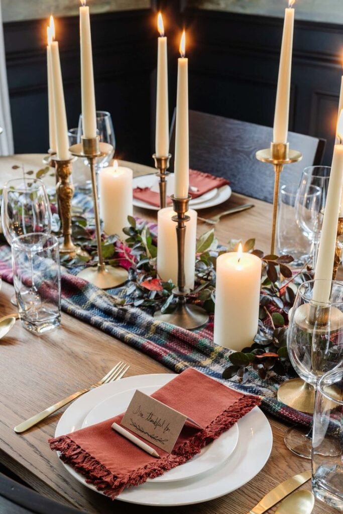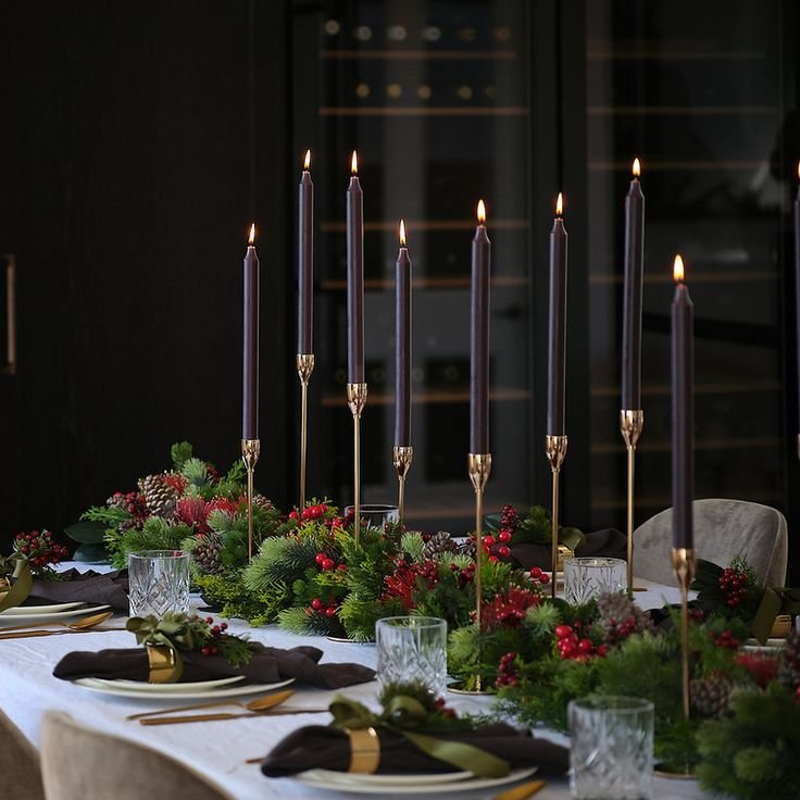 If there’s one winter dining table decor idea I swear by, it’s candle layering. I recommend mixing: