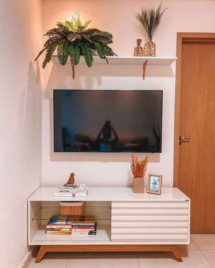 I often use a single sculptural vase or tray and stop there. Minimal decor lets the TV fade into the background, which sounds weird but works beautifully.