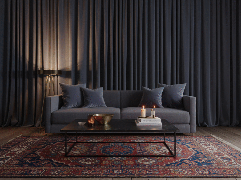 I recommend heavy, textured rugs in dark or muted tones—Persian, vintage, or even modern geometric patterns. Pair them with floor-to-ceiling curtains in a luxurious fabric like velvet or linen.